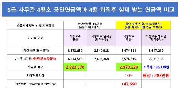 은4월초 공단에서 제시된 금액은 2,922,570원이었으나 4월말에 퇴직하는 분은 47,650원을 더 받고 퇴직하여 공단에서 말하는 4월초 연금액보다 1.63%정도가 더 증가한 세전 2,970,220원을 받아 연금소득세로 86,330원을 공제하고 통장으로 실제 받는 연금액은 288만원 정도가 된다는 정보를 전해드리면서 여기서 마치도록 하겠습니다.