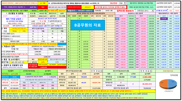 다음은 공무원연금퇴직수당명퇴금 통합프로그램에 기초자료를 입력해서 나온 통합화면으로 B공무원의 자료입니다.