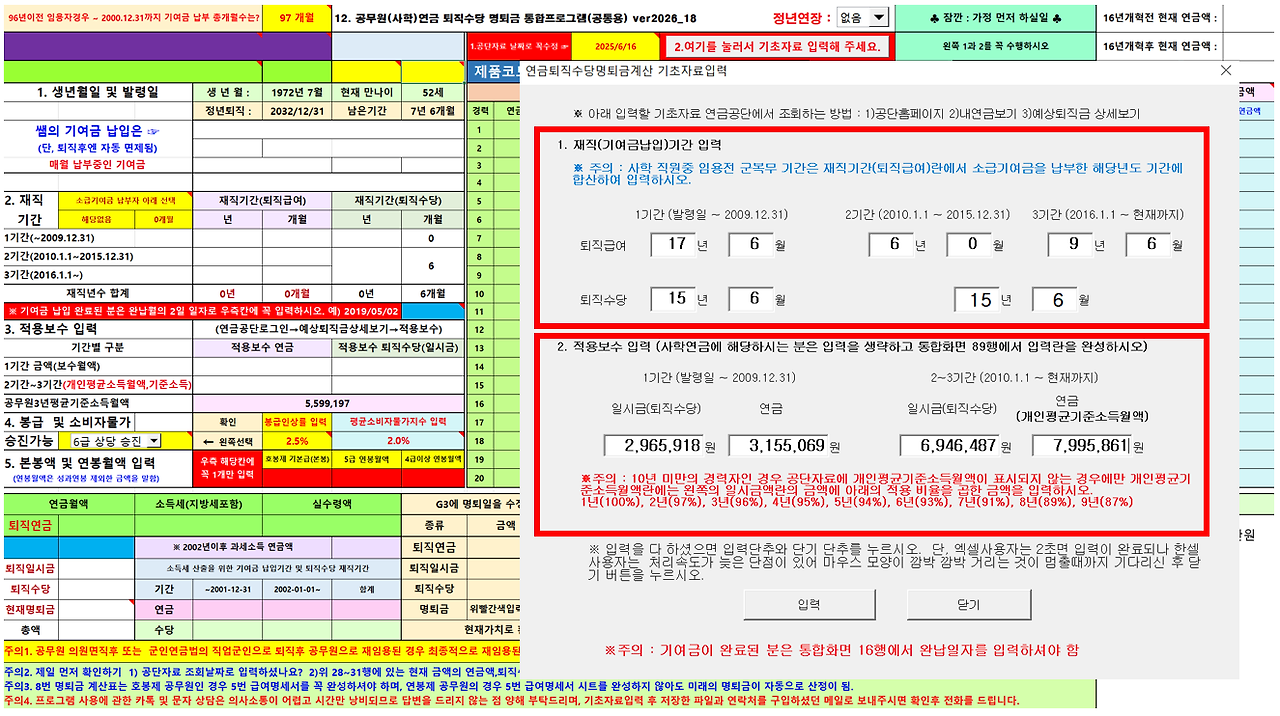 기초자료 입력 후 재직기간·적용보수액을 입력하면 연금·퇴직수당·명퇴금·전액일시금 등 다양한 결과가 자동 계산됩니다.