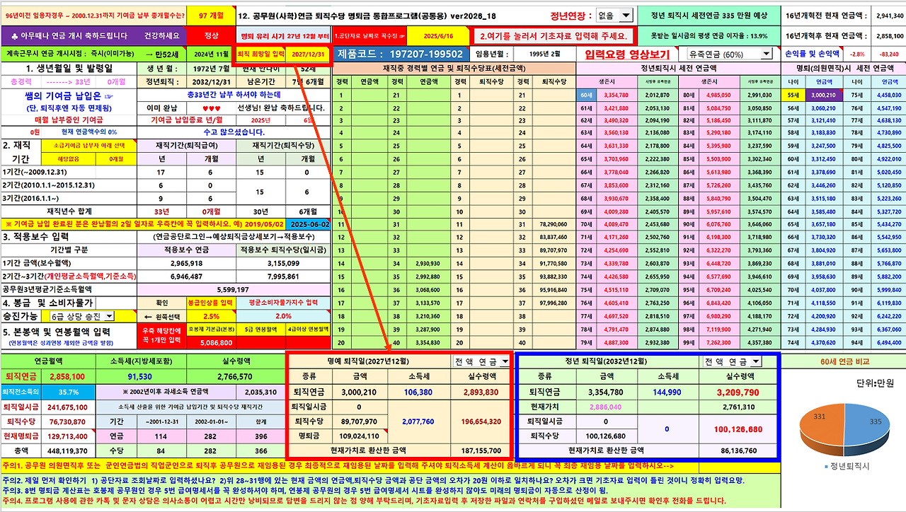 2025년 기준 3만 원(유튜브 시청 시 15,000원 할인)의 ‘12번 공무원연금퇴직수당 통합프로그램’을 활용하여 산출하였습니다.
