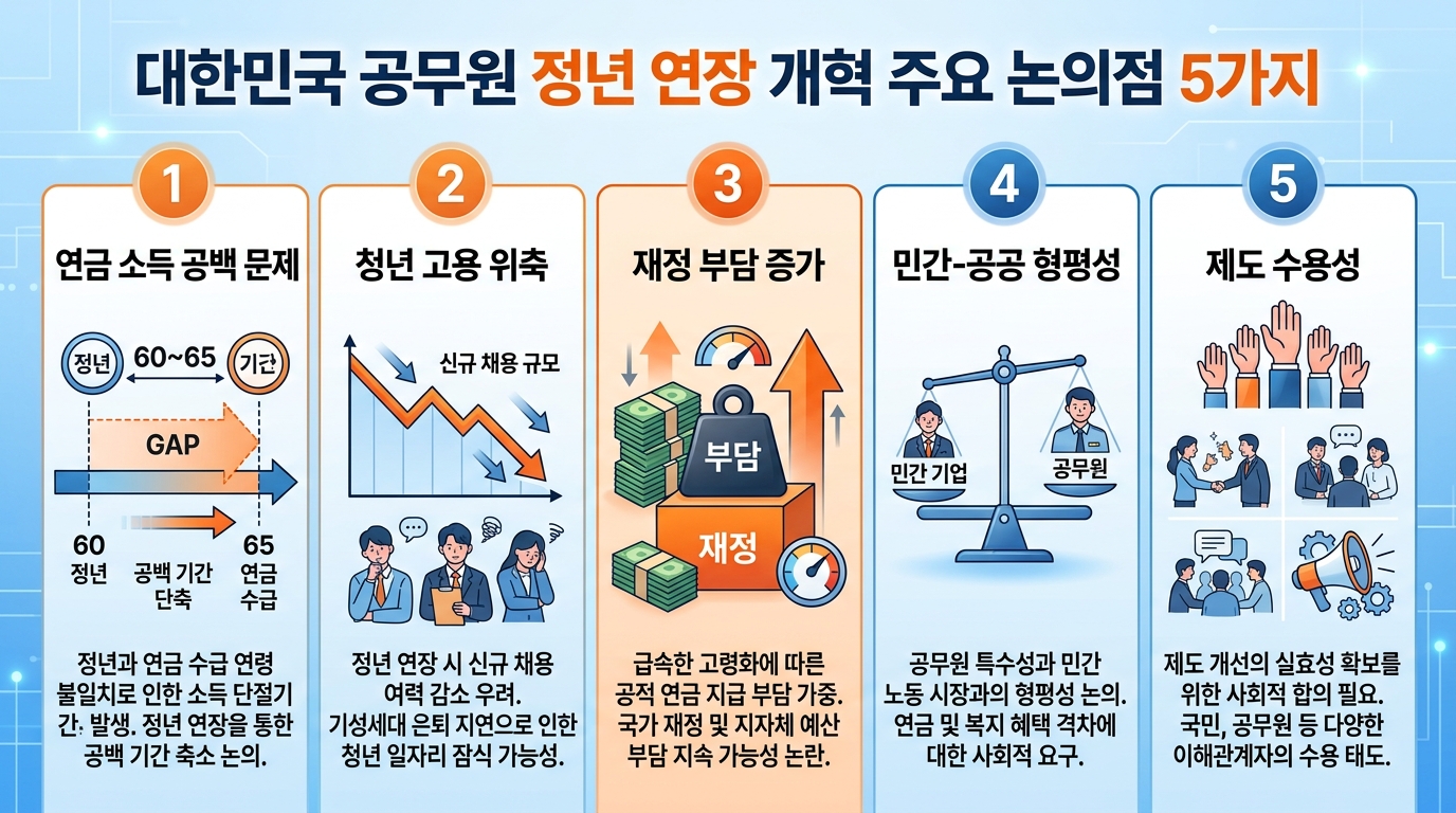 둘째, 청년 고용 위축 문제입니다. 고령 공무원의 재직 기간이 늘어나면 자연스럽게 신규 채용 여지가 줄어들 수 있습니다. 이는 공직 진입을 원하는 청년층의 기회를 제한하는 결과로 이어질 수 있어, 정원 관리 개선과 채용·승진 구조 전반의 개편이 반드시 수반되어야 한다는 의견이 강하게 제기되었습니다.