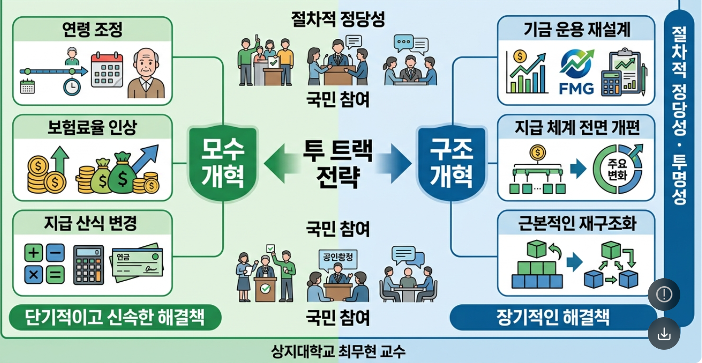 최 교수는 두 방식을 양자택일로 볼 것이 아니라, 단기적으로는 모수 개혁을 통해 재정 안정성을 빠르게 확보하고, 중장기적으로는 구조 개혁을 병행하는 이른바 '투 트랙 전략'이 현실적이고 바람직하다고 제언했습니다.