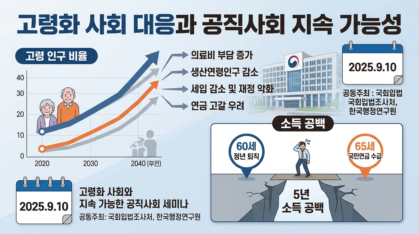 2025년 9월 10일, 국회입법조사처와 한국행정연구원은 "공무원 정년연장과 연금제도 개선방안 모색"을 주제로 공동 세미나를 개최했습니다. 이번 세미나는 단순히 퇴직 연령을 높이는 차원을 넘어서, 고령화 사회에 대응하면서도 공직사회의 지속 가능성을 확보하기 위한 종합적인 제도 개편 방향을 집중적으로 다루었다는 점에서 큰 의미를 가집니다.